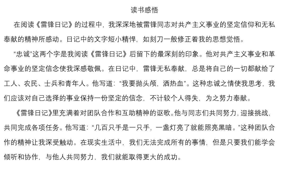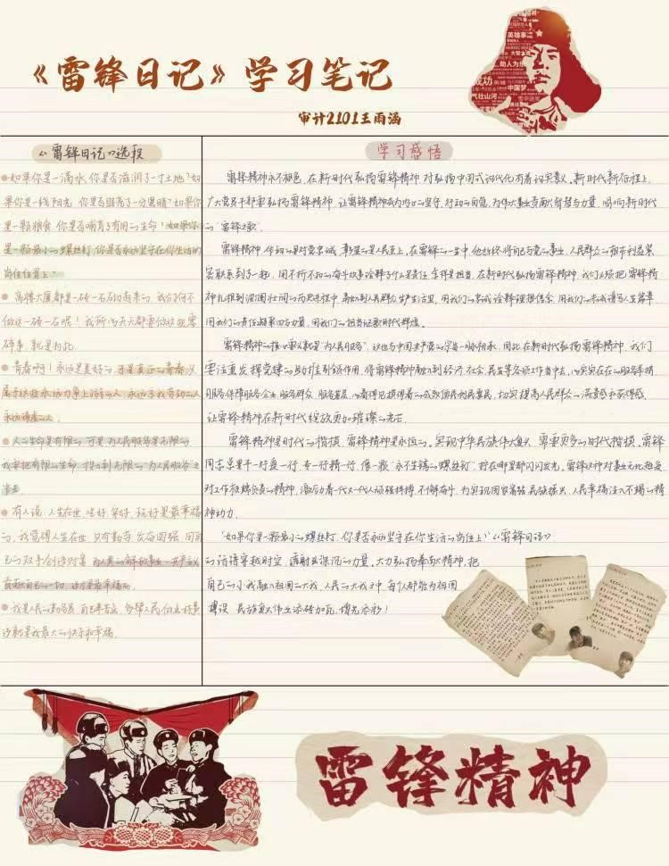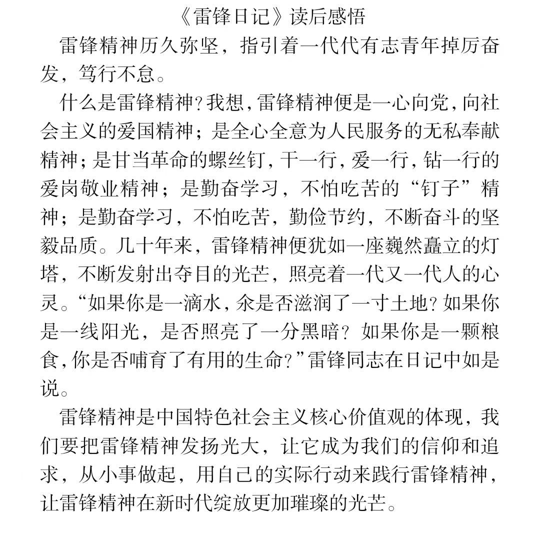 春风拂面,雷锋精神暖人心。六十年来,雷锋精神代代赓续传承,持续滋养着千千万万个我们,历久弥坚。为强化同学们对雷锋精神的认识,倡导无私奉献、乐于助人的社会风尚,MG电子 特举办“心声共勉 向‘锋’而行”感悟撰写活动。在此次感悟撰写活动中,同学们积极参与,认真阅读《雷锋日记》、雷锋传记或观看相关纪录片,更直观、深入地感悟到雷锋同志乐于助人、甘愿为人民服务的伟大精神,用细腻的文字,精美的照片表达了对雷锋精神的赞美和敬佩,创作出许多内容充实,感情真挚的作品。经过认真评选,许多同学的作品被遴选为优秀作品。其中部分优秀作品如下: