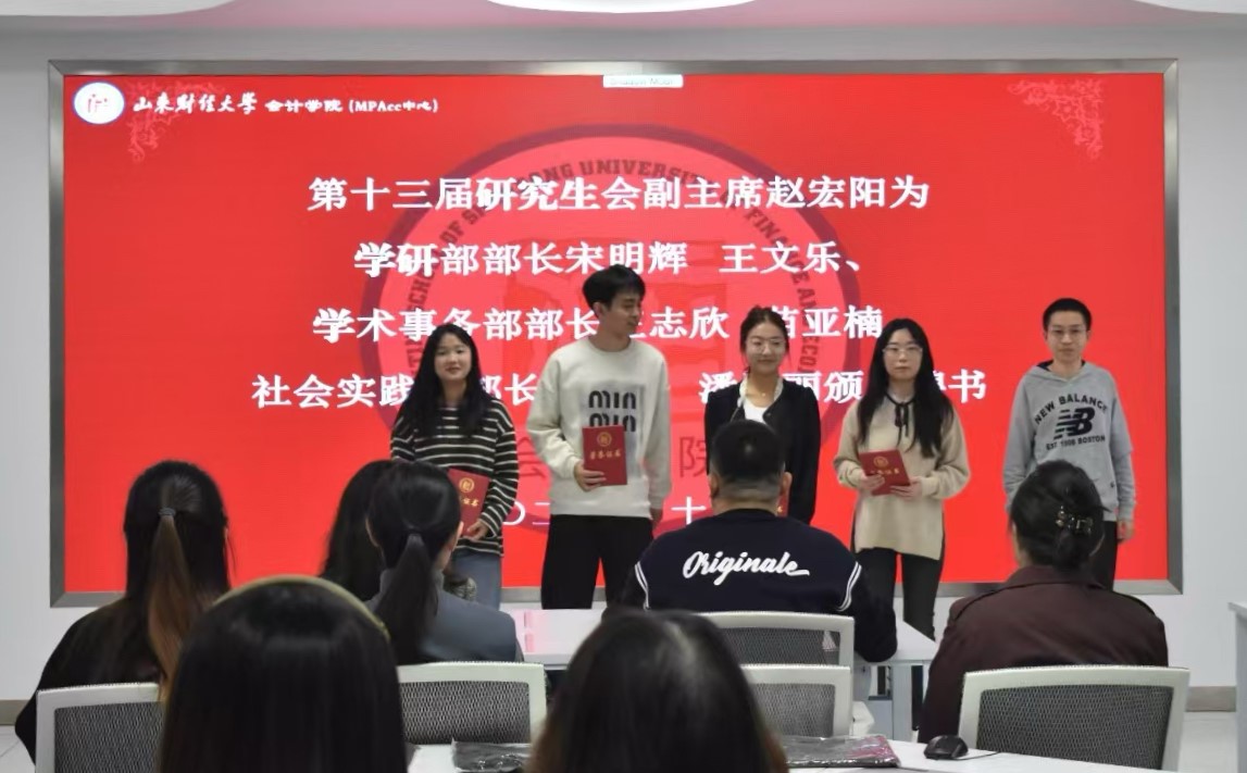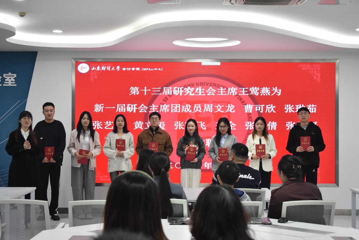 王莺燕宣读了第十四届研究生会成员名单,并由第十三届研究生会主席团向新任主席团成员及各部门部长颁发聘书。