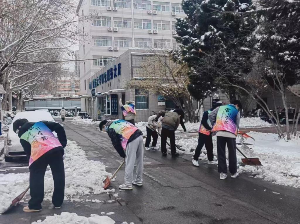 在燕山校区,预备党员和党员们率先垂范,身穿志愿者服装,手持清雪工具,分工协作,高效有序地开展清雪工作。带队老师翟子瑜现场指挥,统筹协调劳动任务,并提醒学生注意防寒保暖及劳动安全。尽管天气严寒,但预备党员和党员们以高度的责任感和使命感投入劳动,重点清理了1-4号宿舍楼附近等地方的积雪,确保学生出行安全畅通,以实际行动展现了先锋模范的引领作用,彰显了新时代学生党员的责任与担当。
