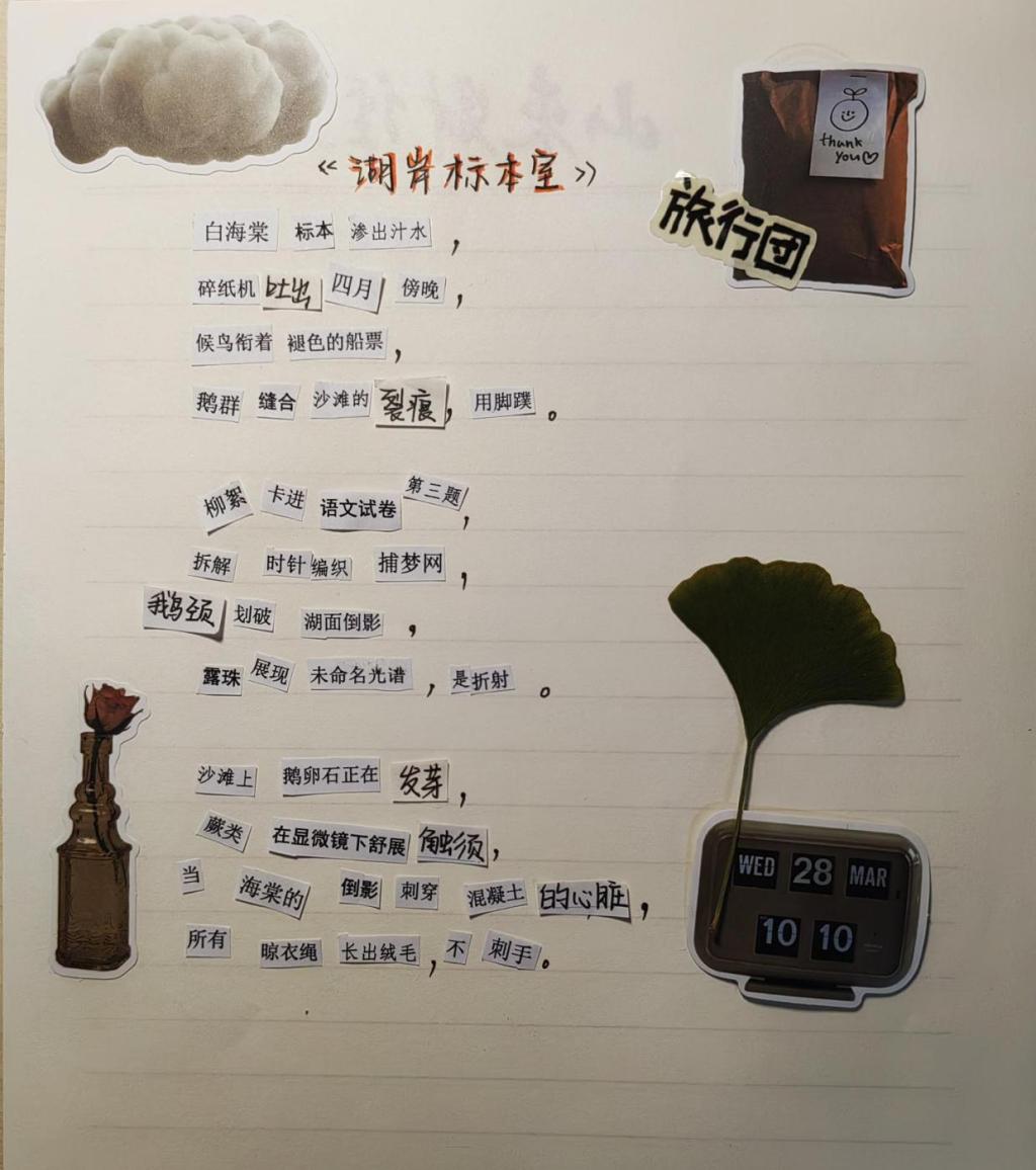 青春剪影,诗意飞扬,MG电子 成功开展了“意剪生活画,诗写青春风”主题拼贴诗活动。同学们凭借大胆想象力,将看似毫无关联的文字碎片,重新组合成富有深意的诗篇,尽情体验文字碰撞与重组带来的纯粹乐趣,为略显单调的校园生活注入新的诗意,让青春在文字的海洋中绽放别样光彩。