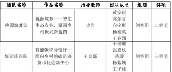 本次赛事中,由黄安琪、高尔誉、向宇彤、杨桂英、王春翔(指导教师:史岩)组成的“桃源筑梦队”项目团队,凭借作品《桃源筑梦——智汇生态农业,擘画乡村振兴新蓝图》一路披荆斩棘,从众多参赛队伍中脱颖而出,斩获二等奖。由于瑾璀、张嘉仪、岳璇、杨紫姨、王子佳(指导教师:王金磊)组成的“好运连连队”项目团队,凭借作品《智能碳积分银行——面向乡村的碳足迹货币化创新平台》荣获三等奖。此次参赛作品紧扣“生态农业”与“碳金融”等国家重大战略议题,展现了财大学子心系家国、服务社会的责任担当。