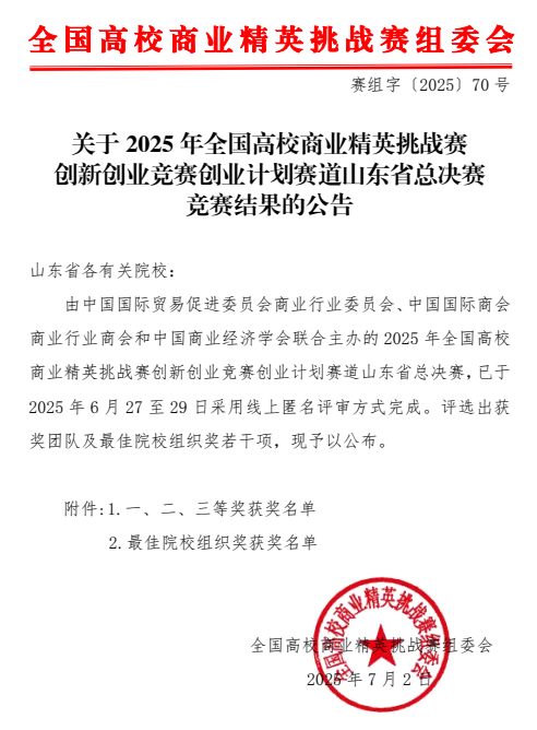 近日,2025年全国高校商业精英挑战赛创新创业竞赛创业计划赛道山东省总决赛结果揭晓。MG电子 硕士研究生代表队凭借精心撰写的商业计划书和高质量的展示陈述视频,在激烈的角逐中脱颖而出,荣获二等奖、三等奖各一项。同时,我校在赛事组织、团队选拔与支持保障等方面表现突出,荣膺“最佳院校组织奖”。