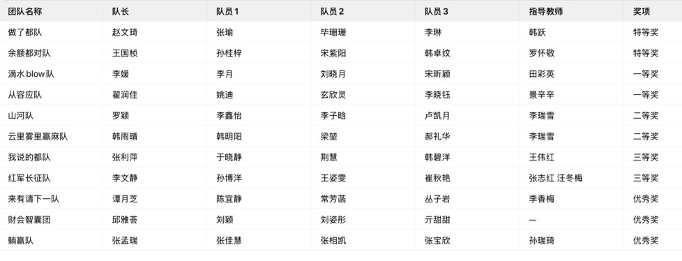 依据大赛章程及校赛评审办法,本届校赛所有参赛队伍均获评级,奖项设置兼顾竞争性与激励性。经过激烈角逐,11支参赛队伍凭借扎实的专业功底与高效的团队协作脱颖而出,具体获奖名单如下: