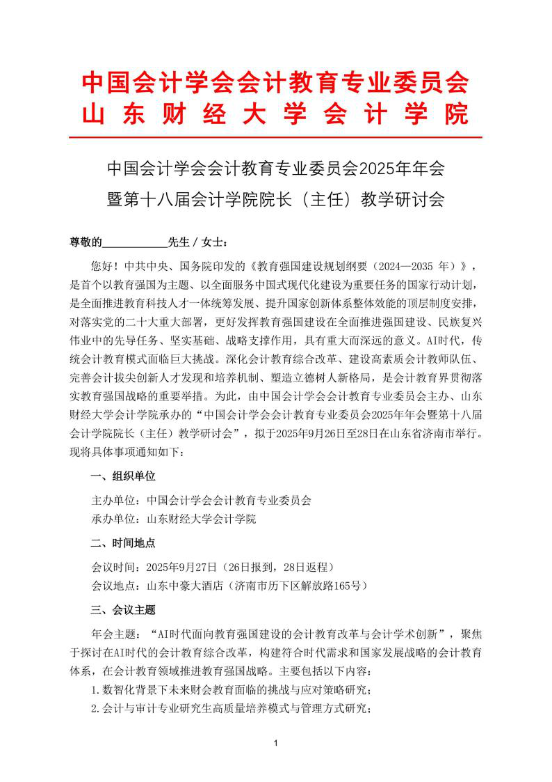中国会计学会会计教育专业委员会2025年年会暨第十八届MG电子 院长(主任)教学研讨会邀请函