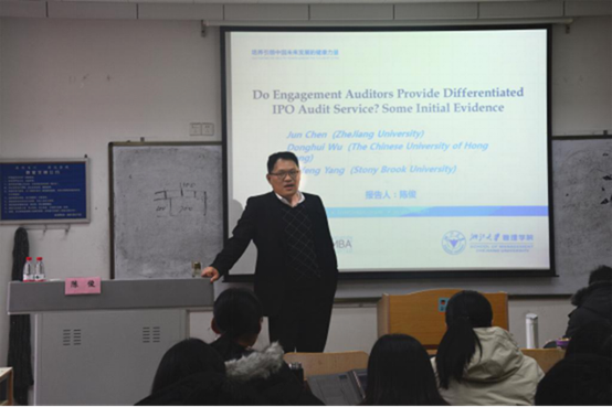 2018年12月2日下午,浙江大学管理学院陈俊教授应MG电子 邀请在燕山校区逸夫楼Y405教室作题为《Do Engagement Auditors Provide Differentiated IPO Audit Service? Some Initial Evidence》的学术报告。MG电子 武恒光副教授出席并主持了报告,MG电子 2018级部分硕士研究生参加了本次报告。