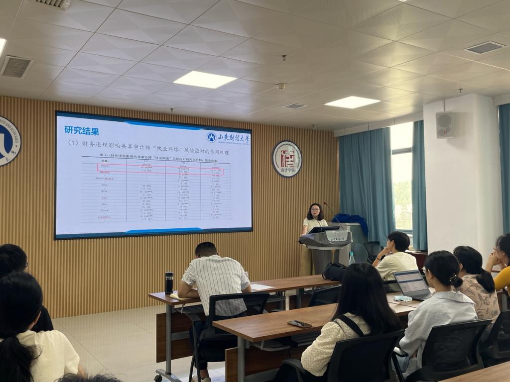 史老师的文章以2007-2021年我国A股上市公司为研究样本,从共享审计师所形成“执业网络”视角探究了财务违规如何影响审计师的风险应对行为。研究结果显示,财务违规会显著减少审计师对“执业网络”内其他企业的审计投入,降低审计收费。机制分析表明,财务违规行为主要通过共享审计师的声誉选择效应降低与“执业网络”其他企业财务报告质量相关的审计风险,从而影响“执业网络”中审计师风险应对行为。进一步异质性分析发现,上述结果在媒体关注度高、法律监管环境好的样本中更为显著。研究结果不仅拓展了财务违规经济后果的研究,而且有助于认识共享审计师如何平衡在“执业网络”内各公司的审计工作。多名青年教师从选题、框架结构等方面点评了论文,并提出了有针对性的改进建议。