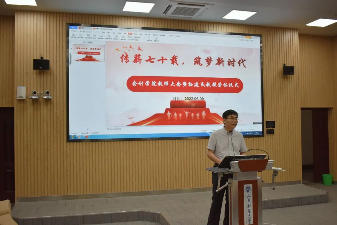 邵文涛向各位老师表达感谢,MG电子 学生体量大,学生工作压力大,疫情之下,各位辅导员奋斗在防疫一线,保障学生的日常生活;全体老师认真备课、上课,保障教学活动的照常进行。随后,邵文涛对MG电子 为庆祝MG电子 建校七十周年暨合并建校十周年所作的准备进行简要介绍:第一,院史录《儒风和畅》记载了前辈对MG电子 的付出,奠定了会院发展的基石,激励师生将院史和奋斗精神传承下去;第二,话剧《前路》以校友为人物原型,讲述了MG电子 70年来自强不息、砥砺前行的故事,展现了学校人才培养薪火相传的精神;第三,院史图片展、红色会计展通过老物件、老照片,追忆MG电子 党的建设、学科建设、人才培养的艰苦历程;第四,学生成果汇编、“书香会院”读书成果沙龙展现会院学工成果,是“立德树人”的具体体现。每一位校友、老师、学生的付出,都是为了表达对学校、学院深厚的情感。