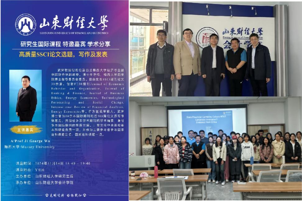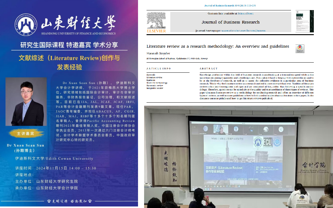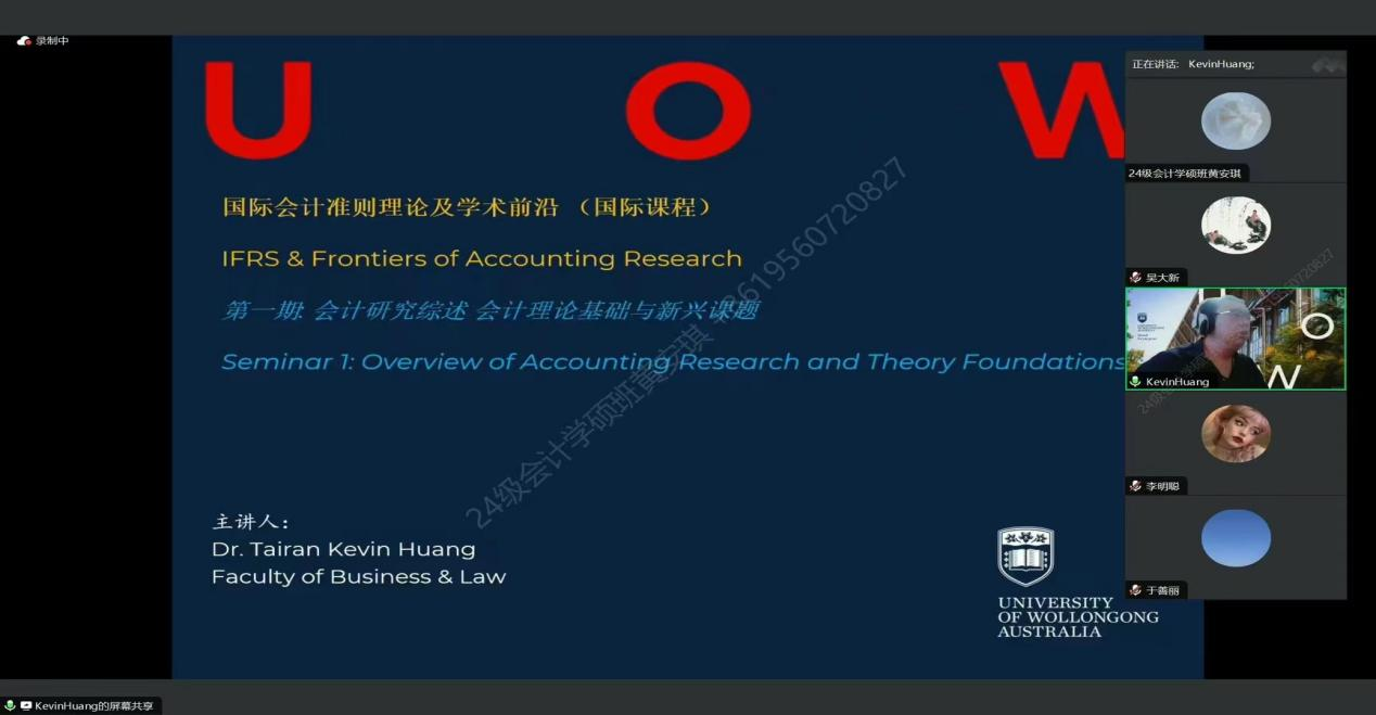 应学院邀请,澳大利亚伍伦贡大学黄泰然博士(Dr. Tairan Kevin Huang)为MG电子 开设研究生国际化课程(《国际会计准则理论及学术前沿》)。黄泰然博士是澳大利亚伍伦贡大学商法学院高级讲师、研究生教学主管、伍伦贡大学商学院中国学生教育同盟会创始人、伍伦贡大学校长最高勋章获得者、澳大利亚国家博士奖学金获得者,兼任会计学术联盟学术指导委员会委员。课程以管理学研究方法论、经典文献选读及文献综述撰写为核心,内容深入而丰富,为MG电子 硕士、博士研究生带提供了宝贵的学术训练机会。