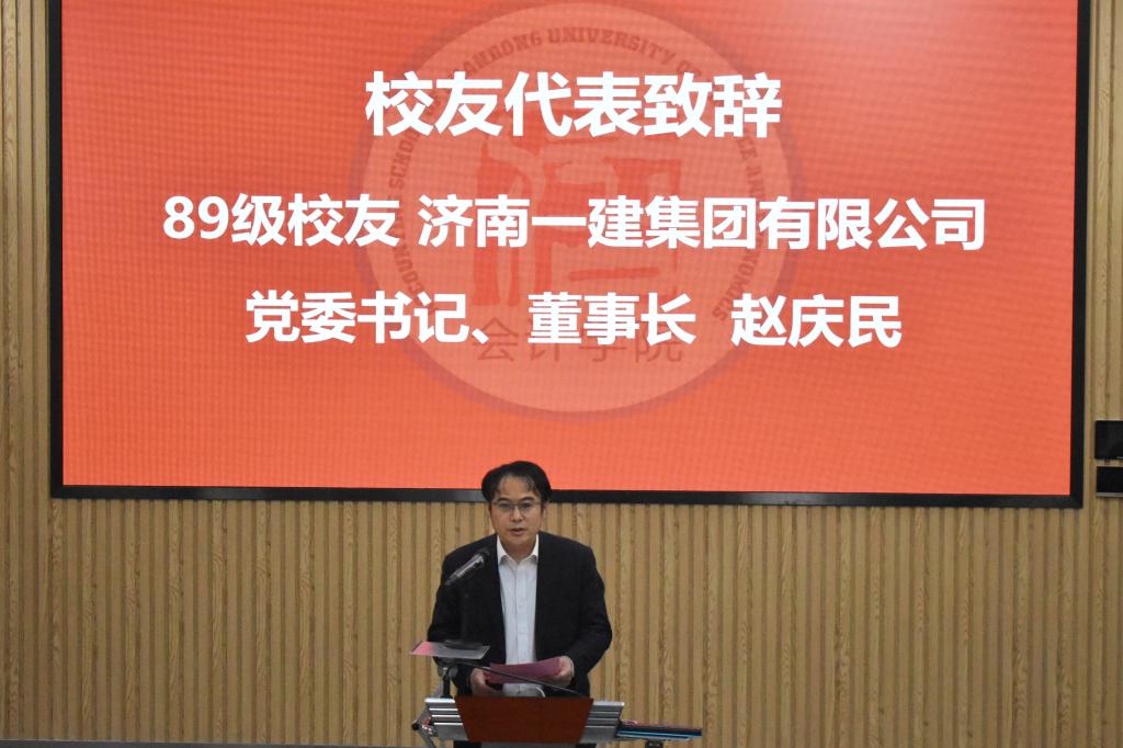 校友代表、89级校友、济南一建集团董事长赵庆民代表广大校友对本次活动的成功举办表示热烈祝贺,对为母校、母院发展壮大作出积极贡献的领导、老师及校友致以诚挚的敬意。他表示,学校的培养让他学到了系统的财务知识、严谨的治学态度及高尚的人格品德,才能在踏入社会后不断突破自我,不断成长,不断进步。离校后,他同广大校友一样,时刻关注着母校各项事业的发展,今后也将不遗余力的为母校的建设发展继续贡献智慧和力量。