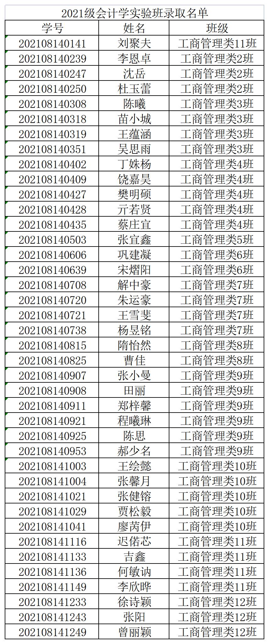 2021级会计学(国际会计)实验班录取名单